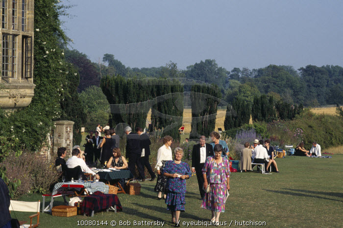 Opera attendees enjoying picnics in the gardens during performance intervalEuropean Great Britain Northern Europe Public Presentation UK United Kingdom British Isles