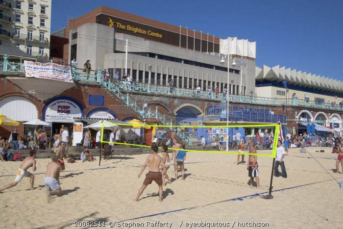 People playing beach volleybal on the sands in front of the Brighton Centre.Center Great Britain United Kingdom