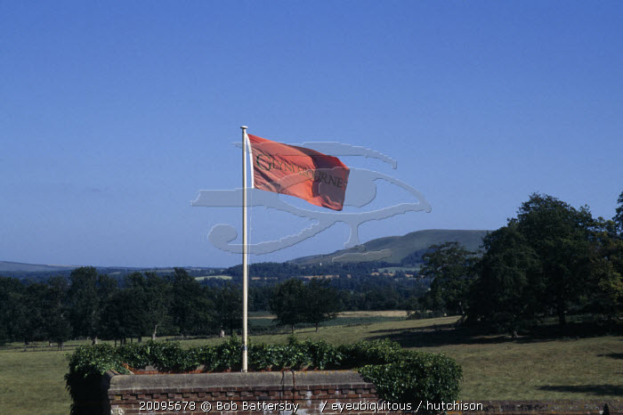 Red flag in the grounds of the country house and opera house looking out over green countrysideNear Lewes. European Great Britain Northern Europe Performance UK United Kingdom British Isles Public Presentation Scenic