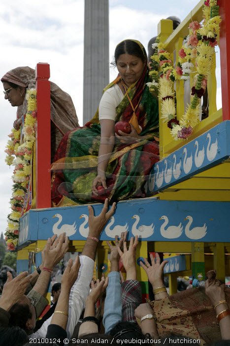 Religion, Hindu, Worship, London Rathayatra celebrations in Trafalgar Square. People handing out offerings during festival.