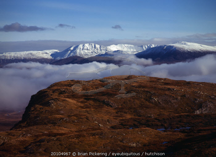 Scotland, Highlands, West, Ben More Forest and snow covered Assynt Mountains, 998 metres at highest point, above thick white cloud on skyline. View from Knockan Crag.