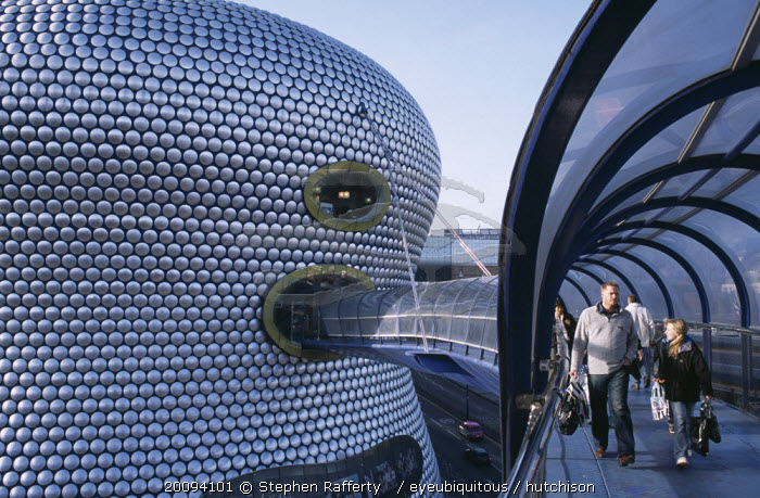 Selfridges Store at The Bullring Shopping Centre. Exterior detail of the spun aluminium discs and shoppers walking through The Parametric Bridge a curved covered footbridge suspended over the street.Centre European Great Britain Europe UK United Kingdom Aluminum British Isles Center Northern Europe