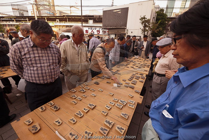Shimbashi, Outside Shimbashi JR station, large group of men, all over fifty years old, playing Shogi, Japanese chess, on large boards with large pieces, all standing, other men watch.