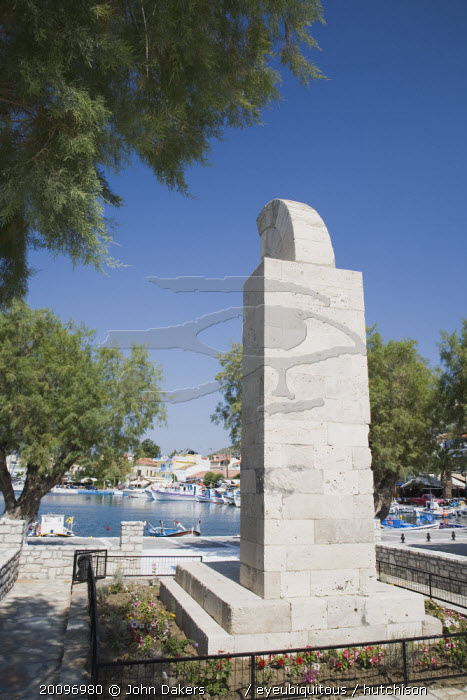 Stone monument in the harbour.sculptureResort Summer Clear Blue Sky early season Aegean Dodecanese Destination Destinations Ellada European Greek Southern Europe