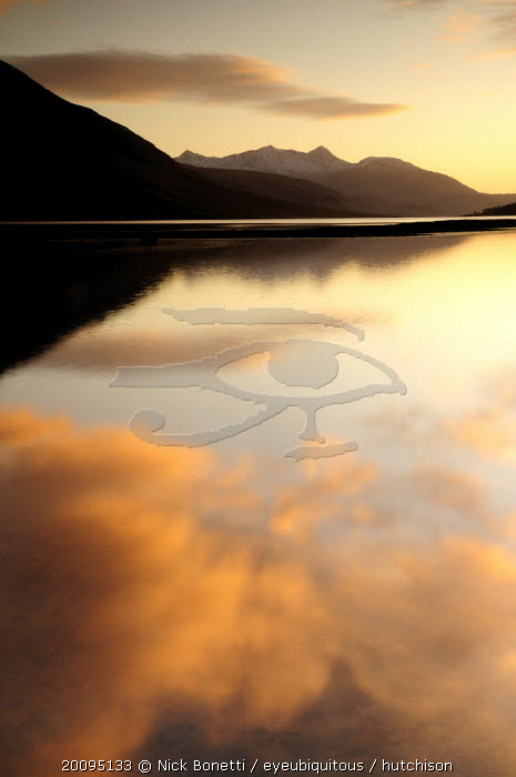 Sunset coloured clouds reflected in Loch Etiveportrait Alba Colored Great Britain Northern Europe UK United Kingdom White British Isles European Sundown Atmospheric portrait Alba Colored Great Britain Northern Europe UK United Kingdom White British Isles European Sundown Atmospheric