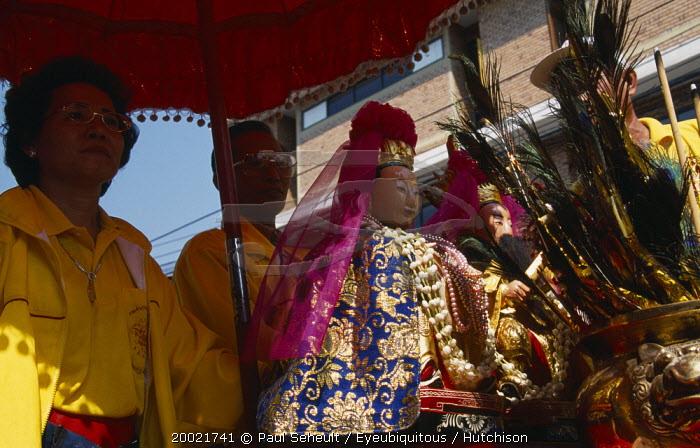 Thailand, North, Chiang Mai, Chinese New Year. Figures of Gods carried to temple in processional float with man and woman holding a red umbrella above them.