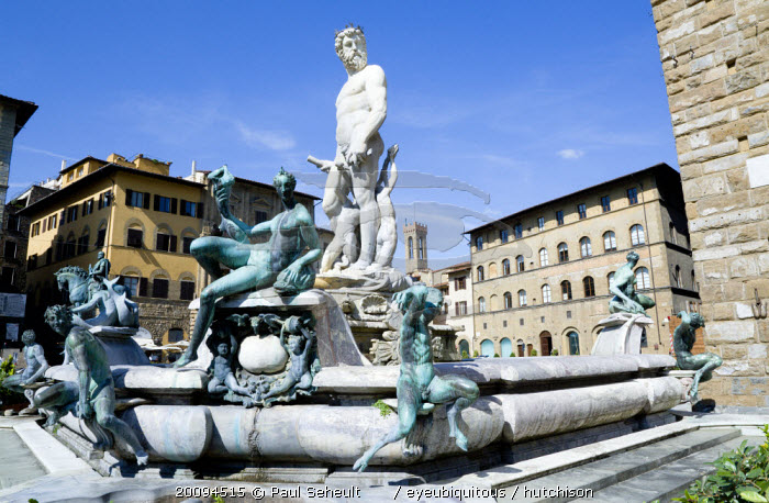 The 1575 Mannerist Neptune fountain with the Roman sea God surrounded by water nymphs commemorating Tuscan naval victories by Ammannatti in the Piazza della Signoria beside the Palazzo VecchioEuropean Italia Italian Southern Europe Toscana Tuscan Firenze History Religion