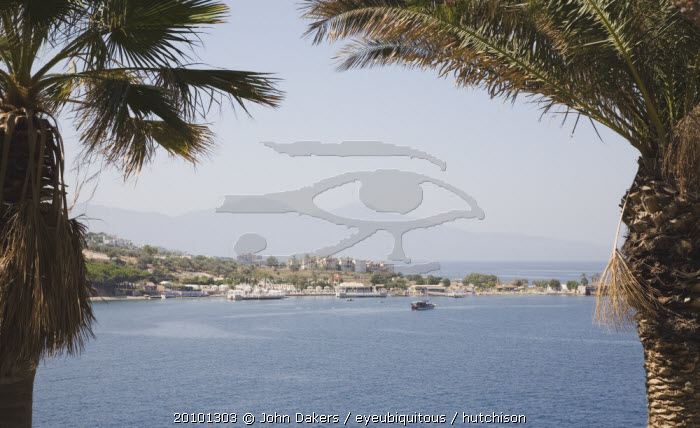 Turkey, Aydin Province, Kusadasi, Guvercin Ada or Pigeon Island, the peninsula of Kusadasi. View across water framed by palm trees.