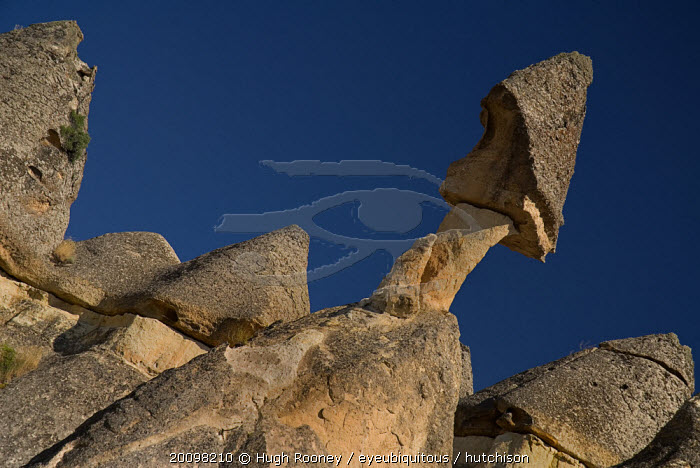 Turkey, Cappadocia, Goreme, Pasabag, Fairy Chimney with rock perched in gravity defying position.