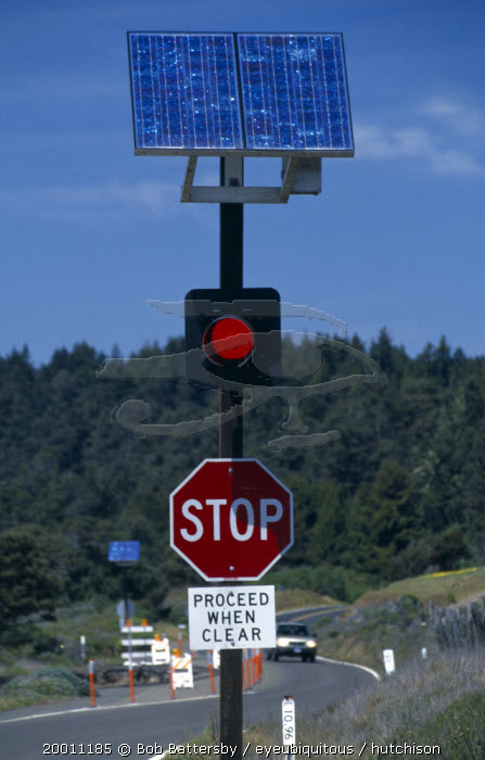 Environment, Solar Power, USA, California. Solar powered red warning light on traffic light next to road side.