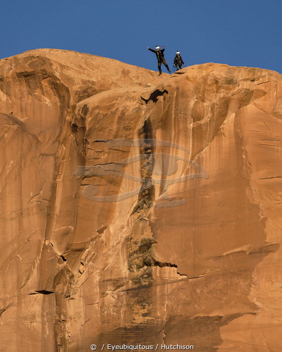 USA, Utah, Moab, A base jumper leaps off the 400 foot vertical face of the Tombstone in Kane Springs Canyon.