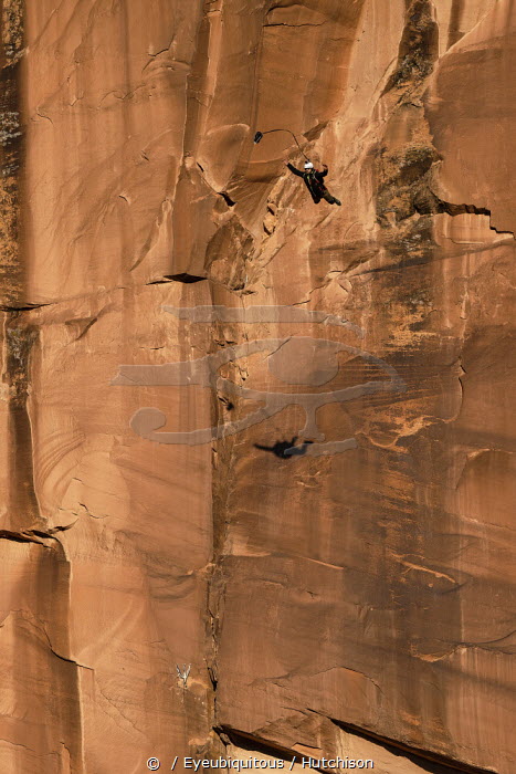 USA, Utah, Moab, A basejumper leaps off the 400 foot vertical face of the Tombstone in Kane Springs Canyon near Moab, Utah. He has deployed his pilot chute.