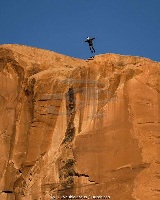 USA, Utah, Moab, A basejumper leaps off the top of the 400 foot vertical face of the Tombstone in Kane Springs Canyon.