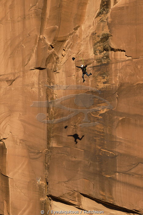 USA, Utah, Moab, A base jumper leaps off the 400 foot vertical face of the Tombstone in Kane Springs Canyon. He has deployed his pilot chute. Note his shadow on the cliff.