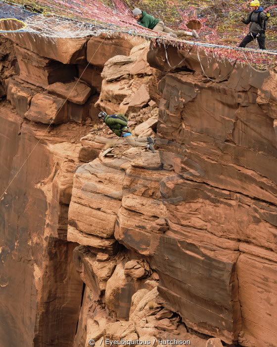 USA, Utah, Moab, A base jumper drops from the Mothership Space Net suspended from the cliffs 950 vertical feet above the valley floor at Mineral Canyon.