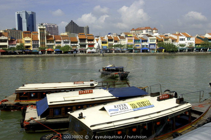 Three moored boats on Singapore River with city architecture on the opposite bank