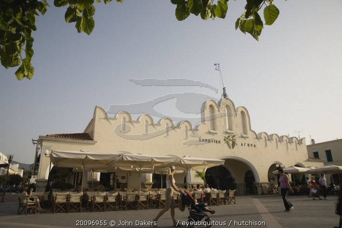 Plateia Eleftherias. Young mother with child in stroller walks through Kos Town Square with view to cafe and market entrance.Greek Islands Resort Summer Clear Blue Sky early season AegeanDestination Destinations Ellada European Greek Southern Europe Bar Bistro Children Immature Kids Mum Restaurant