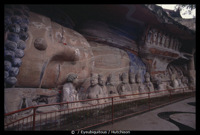 China, Sichuan , Dazu, Large reclining Buddha with line of smaller figures along its side. .