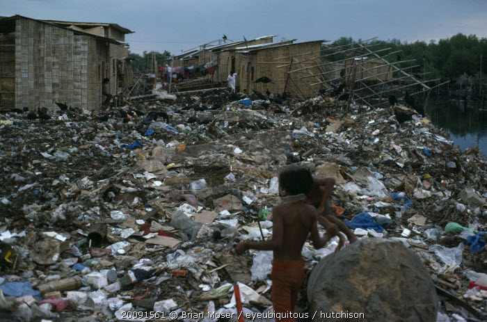 The city rubbish tip in barrio Guayas slum neigbourhood with children playing near large rock in the foreground.American Equador Hispanic Kids Latin America Latino Neighbourhood District shanty South America