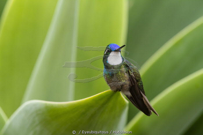 Animals, Birds, A male Grey-tailed or Gray-tailed Mountaingem, Lampornis cinereicauda, perched on an agave leaf in the Savegre River Valley of Costa Rica. Until recently it was believed to be a subspecies of the white-throated mountaingem, Lampornis castaneoventris.