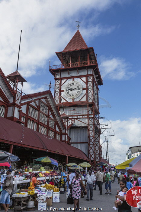 Guyana, Demerara-Mahaica Region, Georgetown, The Stabroek Market was officially chartered in 1842, but a market had existed in that location much earlier. The market building, with its distinctive clock tower, encompasses about 80,000 sq. ft. The iron and steel structure was built in 1881, making it the oldest building still in use in the city. It is a busy hub of life in the city.