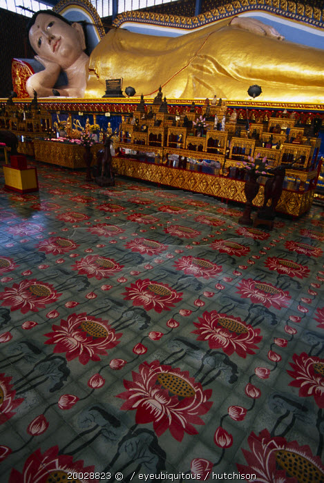 Wat Chayamangkalaram. Interior with 32 metre long reclining Buddha lying behind display of various smaller figures and statues.