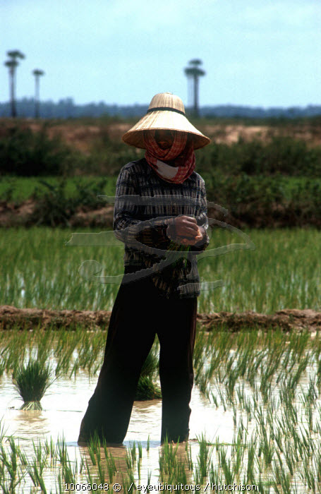 Planting rice 25 minutes north of Prey Veng. Standing figure wearing traditional straw hat and krama.