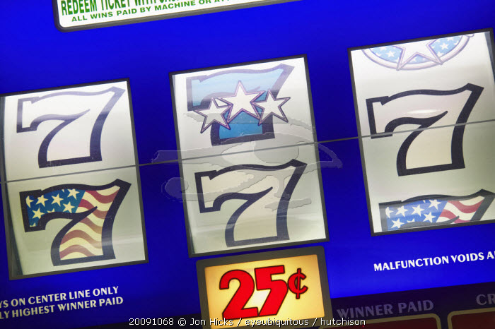 Detail of slot machine dials showing the lucky number seven and 25 cents to play.