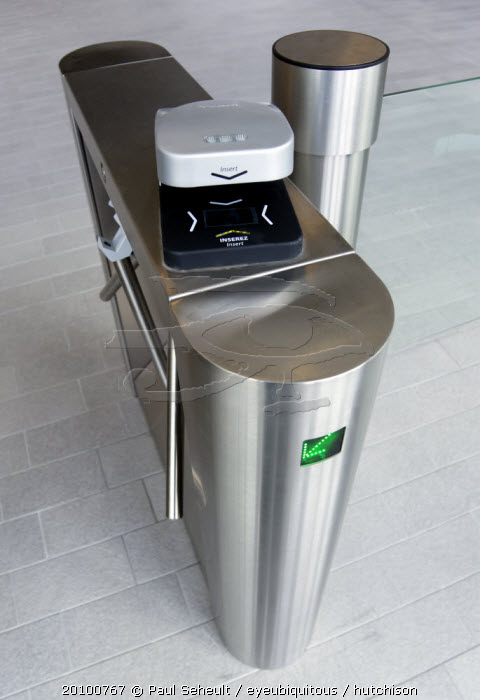 Ireland, County Dublin, Dublin City, Ballsbridge, Lansdowne Road, Aviva Stadium Stainless steel Turnstile with electronic card reader for reading tickets at entrance with green LED arrow pointing to the left.