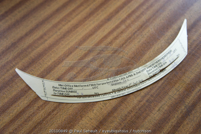 Climate, Weather, Measurements, Summer card for a Campbell–Stokes sunshine recorder or Stokes sphere used by weather observers to monitor the hours of sunshine and showing 9.6 hours duration burnt into the card.