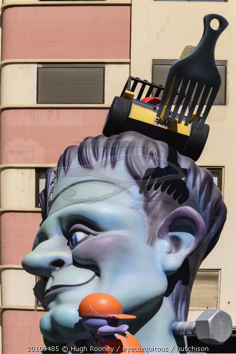 Spain, Valencia Province, Valencia, Papier Mache figure in the street during Las Fallas festival, Detail of face.