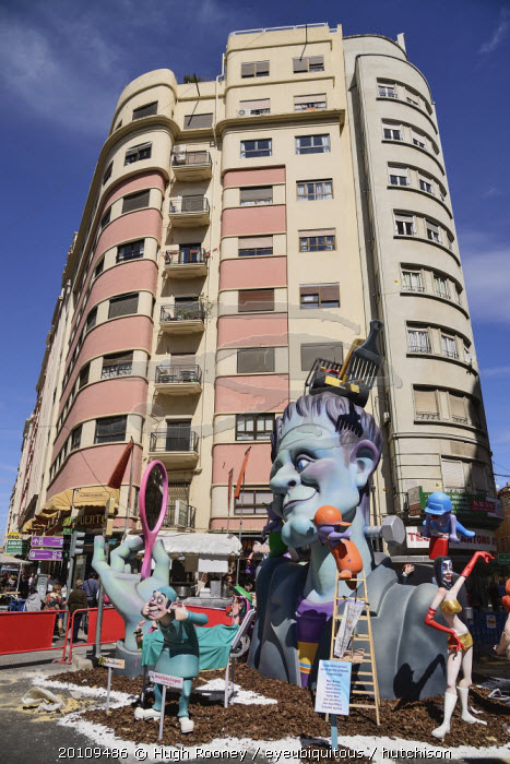 Spain, Valencia Province, Valencia,Typical falla scene with papier mache figures in the street during Las Fallas festival.