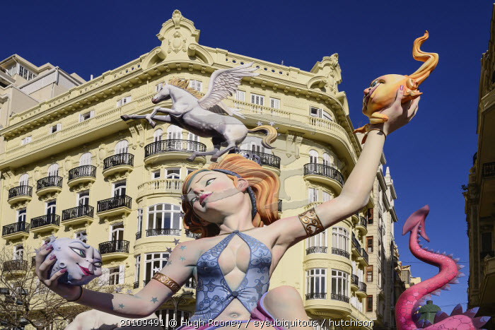 Spain, Valencia Province, Valencia, Female Papier Mache figure with a horse on her head in the street during Las Fallas festival.