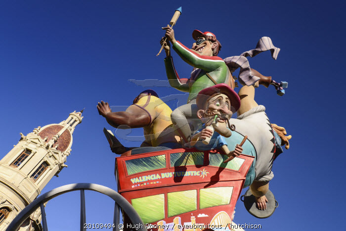 Spain, Valencia Province, Valencia, Las Fallas scene with Papier Mache figures on a Bus Turistic in Plaza Ayuntamiento during Las Fallas festival.