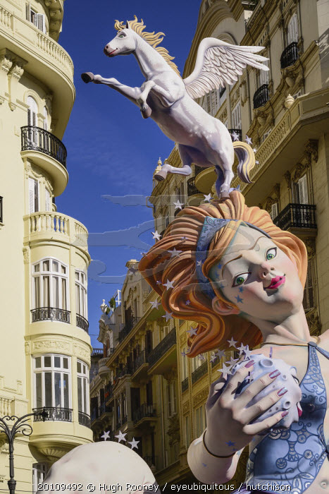 Spain, Valencia Province, Valencia, Female Papier Mache figure with a horse on her head in the street during Las Fallas festival.