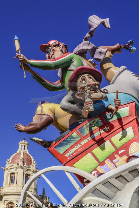 Spain, Valencia Province, Valencia, Las Fallas scene with Papier Mache figures on a Bus Turistic in Plaza Ayuntamiento during Las Fallas festival.