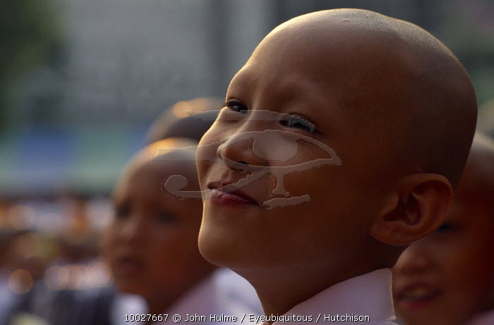 Thailand, North, Chiang Mai, Portrait of novice monk at mass ordination ceremony.