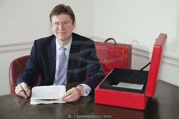 England, London, Greg Clark MP pictured at the Treasury Office with red box.