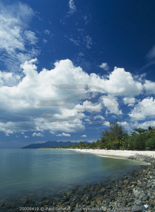 Pantai Cenang beach looking towards Gunung Mat Cincang with a stoney beach in the foreground