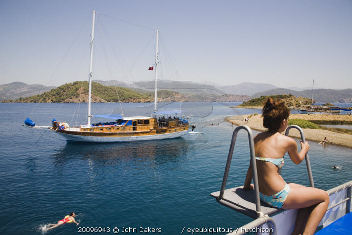 Young Turkish woman in bikini sitting on diving platform on boat off Gemiler or St Nicholas Island with another woman swimming in water below and moored boat beyond.Fethiyeformerly Telmessosformerly modern Greek MakriAegeanTurkish rivieraSaint Nicholas LycianLyciaNicholas of MyrasummerseasonsuntouristholidaycruiseseacalmbaymooringresortEuropean Southern Europe Destination Destinations Female Women Girl Lady Immature Middle East Salt Water Waves Sightseeing Tourists Turkiye Western Asia