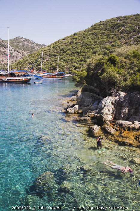 Gulet pleasure boat moored off Gemiler or St Nicholas Island with tourists swimming in perfect clear water in early summer season over Byzantine ruins under water.Fethiyeformerly Telmessosformerly modern Greek MakriAegeanTurkish rivieraSaint Nicholas LycianLyciaNicholas of MyraByzantineSummerseasonsunholidaycruiseseabrightblue skycalmbaymooringswimbathingresorttripEuropean Southern Europe Destination Destinations Holidaymakers Middle East Salt Water Waves Tourism Turkiye Western Asia