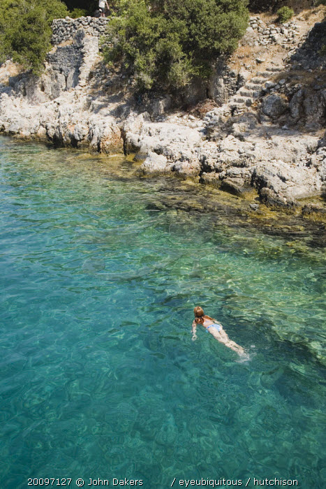 Female tourist swimming in clear aquamarine water off Gemiler or St Nicholas Island with Byzantine ruins under water surface.Turkish RivieraAegeancoastcoastalresortholidayDestination Destinations European Holidaymakers Middle East One individual Solo Lone Solitary Sightseeing Tourism Tourists Turkiye Western Asia