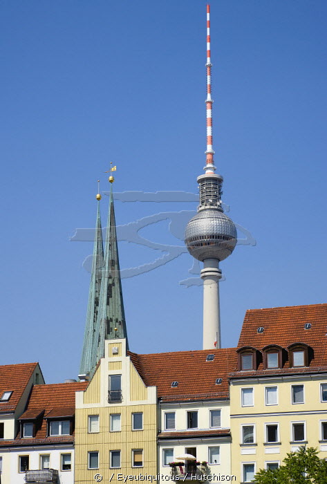 Germany, Berlin, Mitte, buildings beside the River Spree in the St Nicholas Quarter, the Nikolaiviertel, with the twin spired church of St Nicholas, the oldest church in the city and the Fernsehturm TV Tower beyond.
