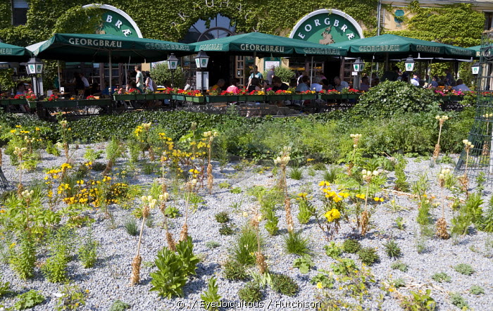 Germany, Berlin, Mitte, The Brauhaus Georgbreau brewery and restaurant bar in the St Nicholas Quarter the Nikolaiviertel with diners seated at tables under umbrellas beside plants planted in gravel in St George's Square.