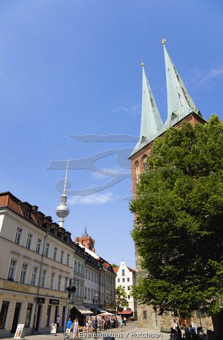 Germany, Berlin, Mitte, the old St Nicholas Quarter, the Nikolaiviertel, with the twin spires of Nikolaikirche and the distant Fernsehturm TV Tower with sightseeing tourists walking past tourist shops and restaurants.