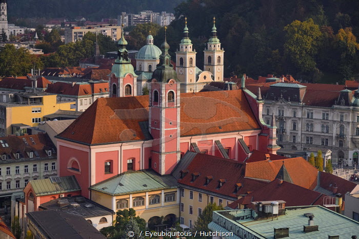 Slovenia, Ljubljana, Vista of the city from the 12th floor viewing terrace of the Neboticnik or Skyscraper Building with the Franciscan Church of the Annunciation and the Cathedral of St Nicholas prominent.