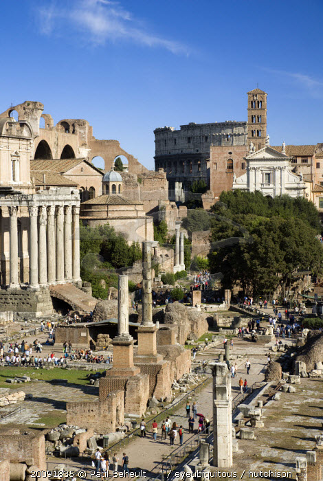 View of The Forum with the Colosseum rising behind the bell tower of the church of Santa Francesca Romana with tourists and the Temple of Antoninus and Faustina the Temple of Romulus and the Basilica of Constantine and Maxentius on the leftEuropean Italia Italian Roma Southern Europe History Holidaymakers Religion Religious Tourism