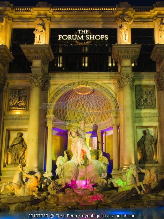 USA, Nevada, The Strip, Caesars Palace Forum Shops exterior illuminated at night.