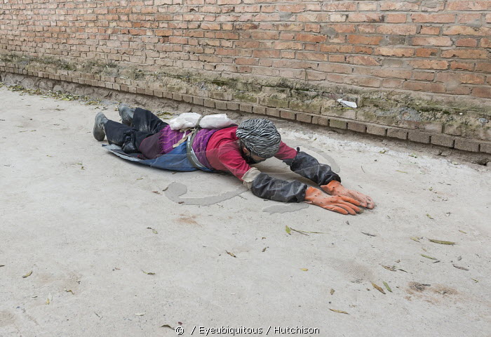 China, Tibet, Pilgrim doing kora by performing full body prostrations near Longwu monastery.