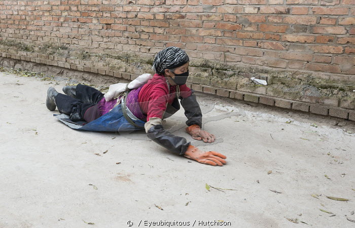 China, Tibet, Pilgrim doing kora by performing full body prostrations near Longwu monastery.